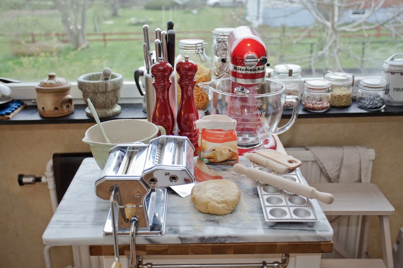 Börja med att göra pastadegen som behöver vila någon timme inslagen i plastfolie i kylskåpet.